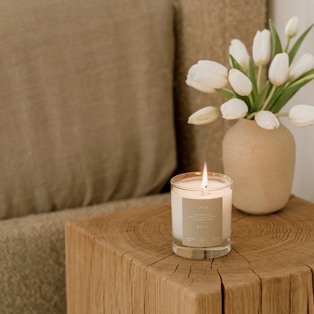- A floral and woody candle that seamlessly diffuses to create a signature scent personality in every room. Balancing masculine and feminine, bold and understated, familiar and unexpected, Cuir Rose plays with the beauty of natural nuance—like sea-dampened blooms on the California coastline or the storied past of a vintage leather jacket.